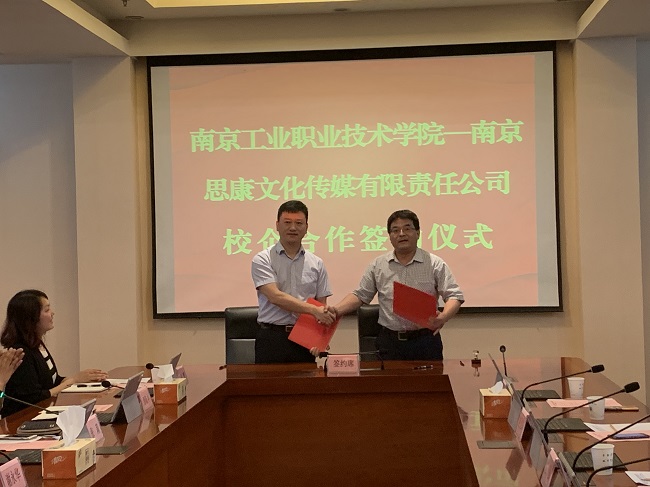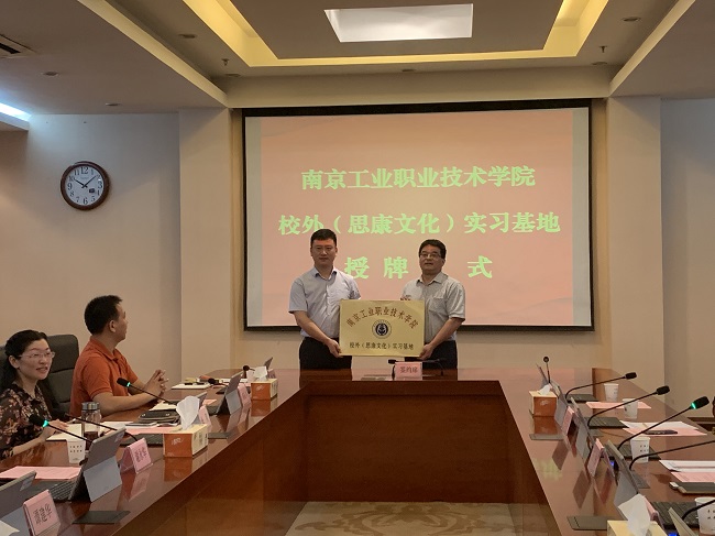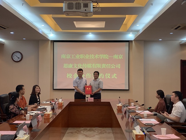 谢永华校长首先致欢迎辞,谢校长代表学校对王强董事长一行莅临爱体育网页版洽谈合作表示热烈欢迎,并对双方能够达成富有建设性的合作成果充满信心。王强董事长也表达了希望与爱体育网页版进行多方面合作的美好愿望。随后,谢永华校长和王强董事长代表校企双方签署了校企合作协议,谢永华校长代表学校向王强董事长授予了“南京工业职业技术学院校外(思康文化)实习基地”铜牌,并颁发了爱体育网页版“客座教授”聘书,校企双方与会人员共同见证了校企合作签约及授牌仪式。