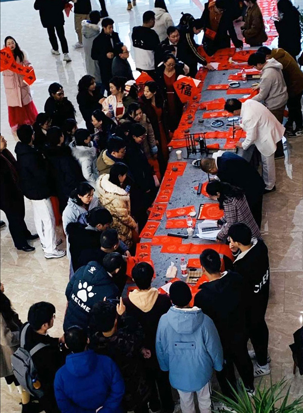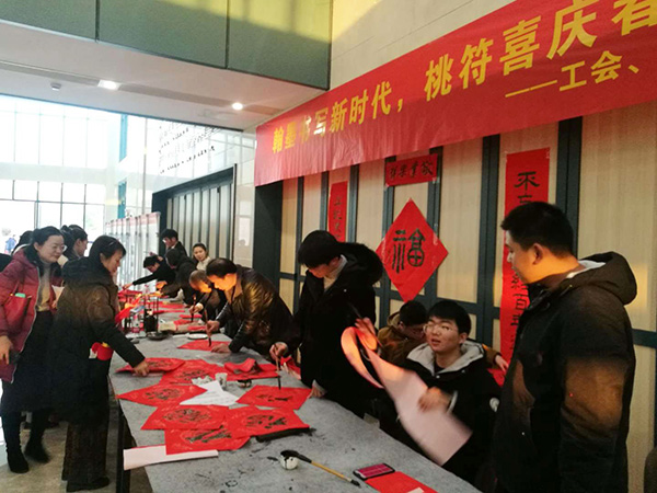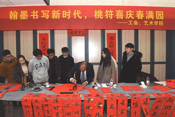 值此2020新年到来之际。南工院举行了辞旧迎新大联欢。工会,艺术设计学院,校书法协会联合举办了以“翰墨书写新时代,桃符喜庆春满园”为主题的送春联送福字活动。活动启动仪式由(全国)教育书画协会高等书法教育分会理事、校党委委员、纪委书记于林惠教授提笔书写“福字”开始,接着由(全国)教育书画协会高等书法教育分会会员、书法协会指导老师刘圣进书写自撰对联:不忘初心历经百年迈进新时代,牢记使命双手万能创造大未来。然后广大师生一起挥毫,数千师生积极参与。近年来,爱体育网页版书法艺术在三全育人,立德树人,增进学校文化氛围,提升师生文化自信等方面做了一些尝试,为学校文化育人作出了积极的贡献。通过这次活动,锻炼了书法协会同学们的动手能力,加强了广大师生员工的情感交流,也表达了书法协会新年深情的祝福:祝福祖国繁荣昌盛、人民幸福安康!祝福学校蒸蒸日上,又上新台阶!祝福全校师生新年快乐,万事顺意!