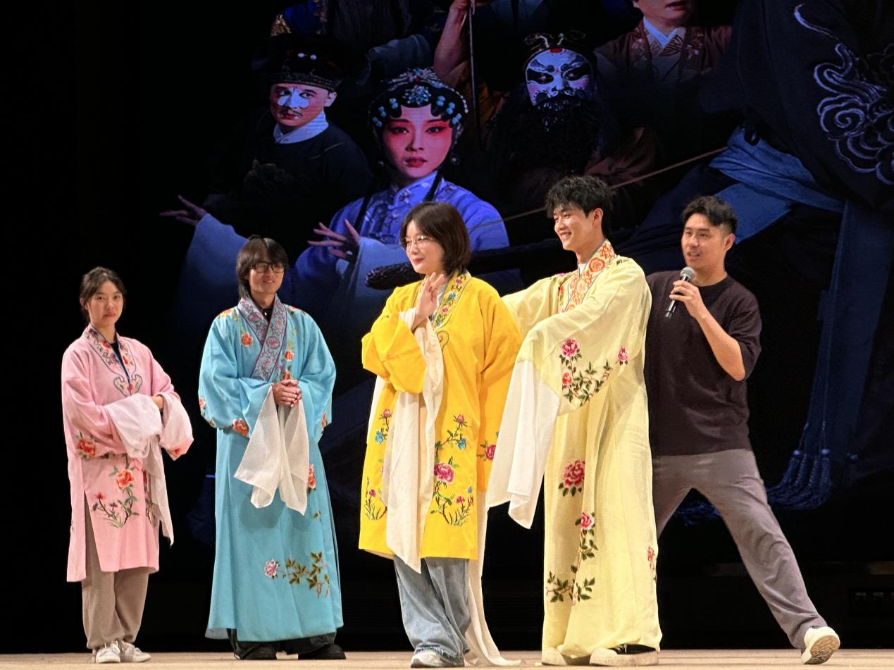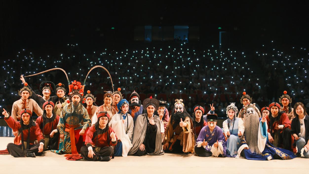在正式开场前的专业导赏环节,国家三级演员徐昀老师向师生们生动细致地讲述了昆剧的文化常识,并现场邀请同学们上台参与互动,学习昆剧身段表演,让同学们沉浸式感受戏曲之韵味。昆剧《林冲》由江苏省苏州昆剧院排演,全剧分为开篇、遇暗、设计、遭陷、生别、贞拒、行路、夜奔、尾声九折,以英雄人物林冲的悲剧人生为主要线索。剧目通过演员精湛的演技和细腻的表演,成功塑造了各具特色、立体生动的人物形象,展示了昆曲艺术的独特魅力,现场师生们被细腻生动的表演深深吸引,现场掌声雷动,经久不息。